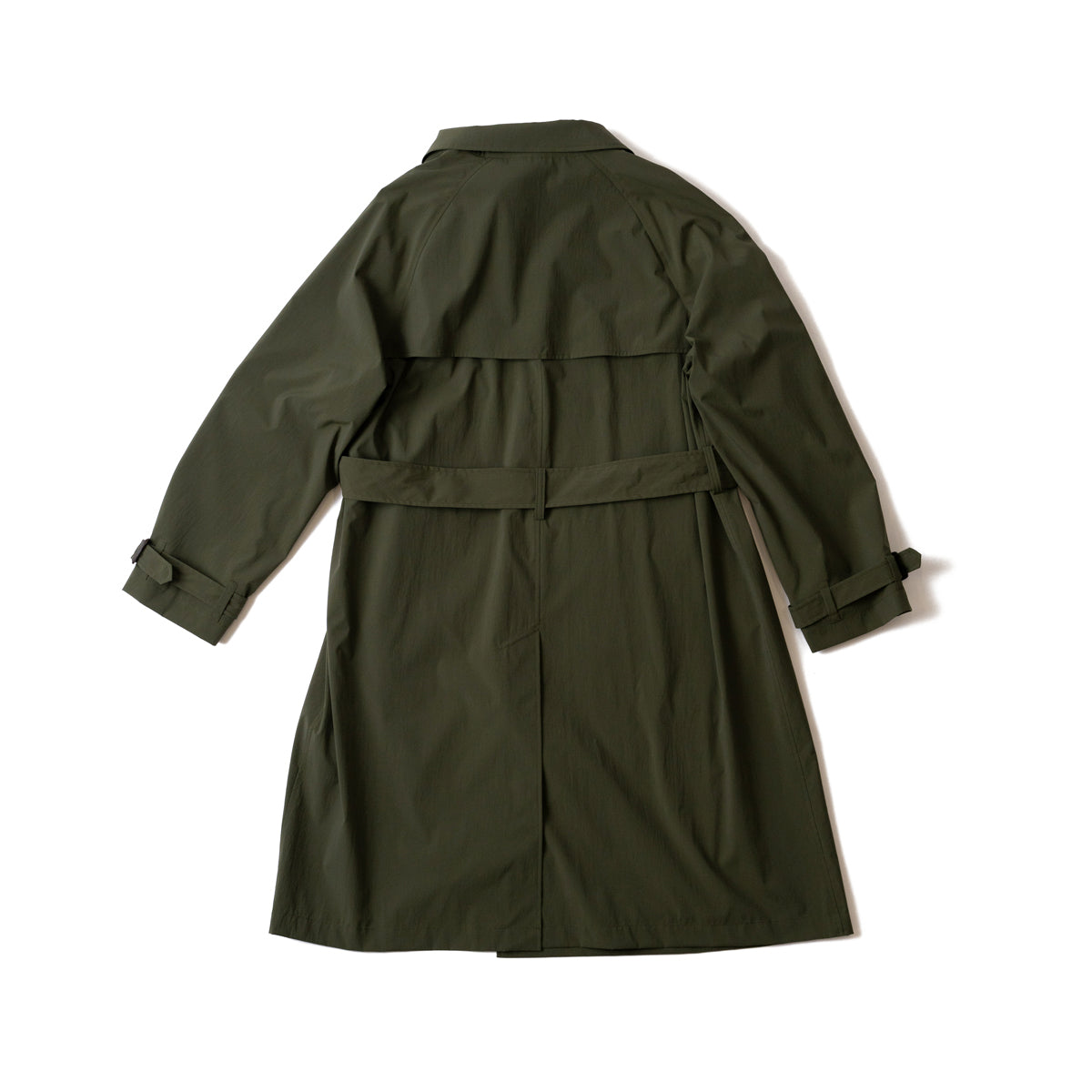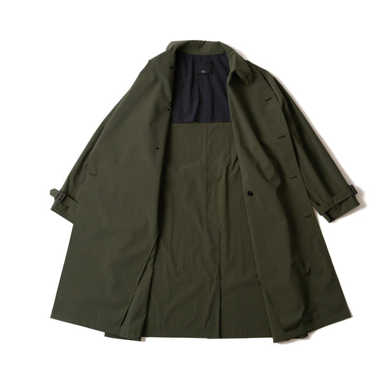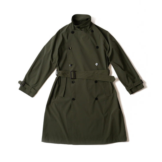 英国的でクラシカルなデザインから、あえてトレンチコートを象徴するエポレットなどのディテールを排しミニマルに仕上げた一着。繊細なパターンメイキングによるラグランスリーブと、ややゆとりのあるシルエットが、インナーや季節を選ばない絶妙なフィット感を実現しています。Aラインの美しいシルエットは、ボタンの留め方やウェストベルトによってさらに異なった印象を与えることもでき、ビジネススタイルからスポーティカジュアルまで幅広いスタイリングに溶けこみ、様々な着こなしを楽しめます。裏地は肩から裾までの裏地を省いた半裏仕立てのため軽く、真夏以外の長いシーズン着用可能です。