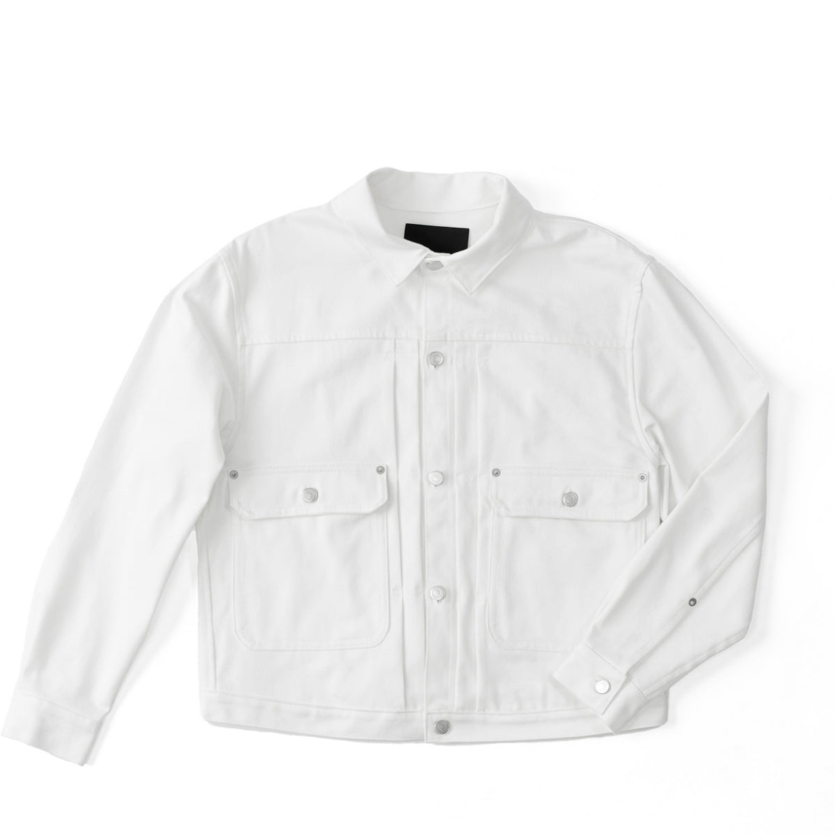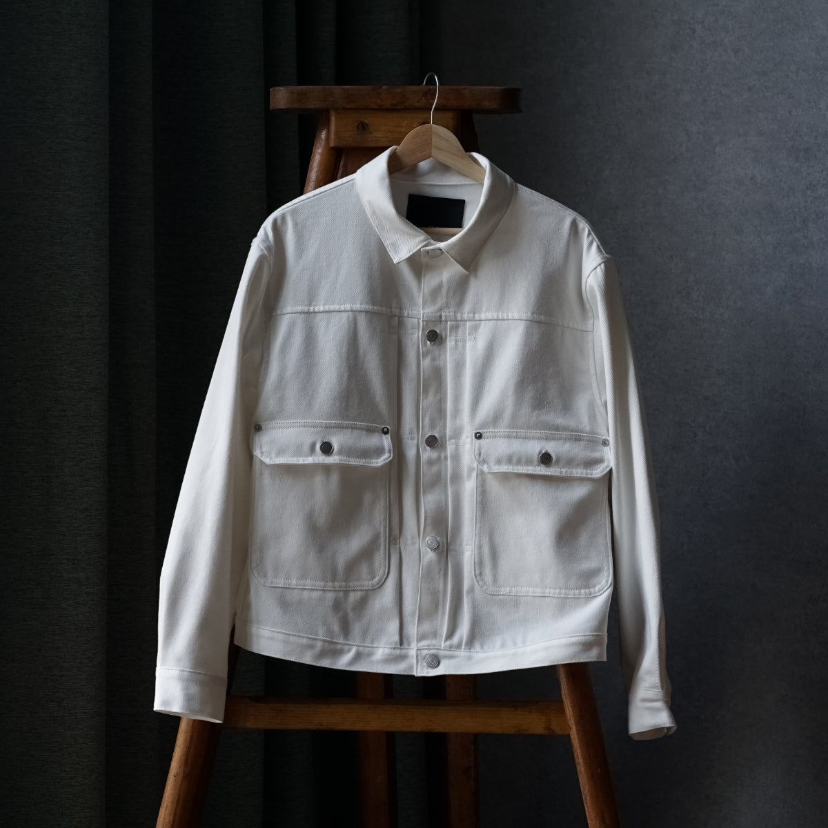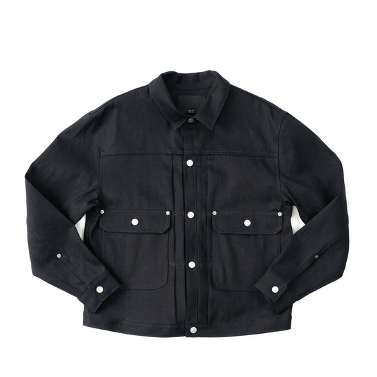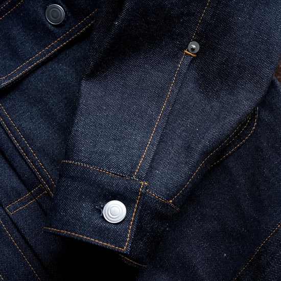 Gジャンの原型とも言われるプロトタイプ的存在であるリベテッドブラウスに、いわゆる2ndタイプのディテールを融合させたユニークなデニムジャケット。シャツのように台襟を持ち、着用時に襟がきれいに立ち上がるエレガントな仕立て。2ndタイプの特徴でもある両サイドに付けたパッチ&フラップポケットはサイズを大きく採りディフォルメを施しながら、全体のバランスは均整のとれたデザインに仕上げています。