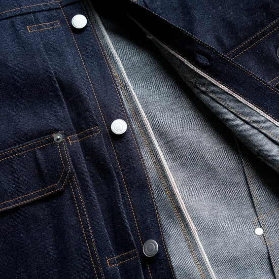素材は、吟味に吟味を重ね独自に手を加えたオリジナルの12オンスデニム。デニムの産地として世界に名高い岡山、倉敷で生産されるその生地は、古き良き趣のあるヴィンテージデニムを彷彿とさせる「赤ミミ」セルヴィッジ仕様で素晴らしい出来栄え。