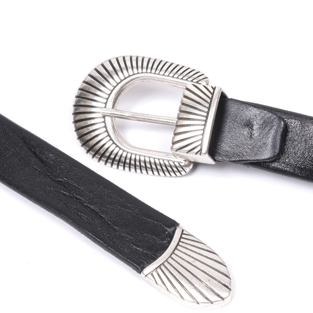 使用しているのはガーメントダイレザー。 独特の濃淡とシュリンクがビンテージ風味を漂わせ、腰回りにこなれ感を演出してくれます。 そんなレザーと相性の良い、真鍮製ウェスタンバックル。 同素材の金具が先端にも取り付けられ、ちらりと見える部分にも個性が光る一本です。