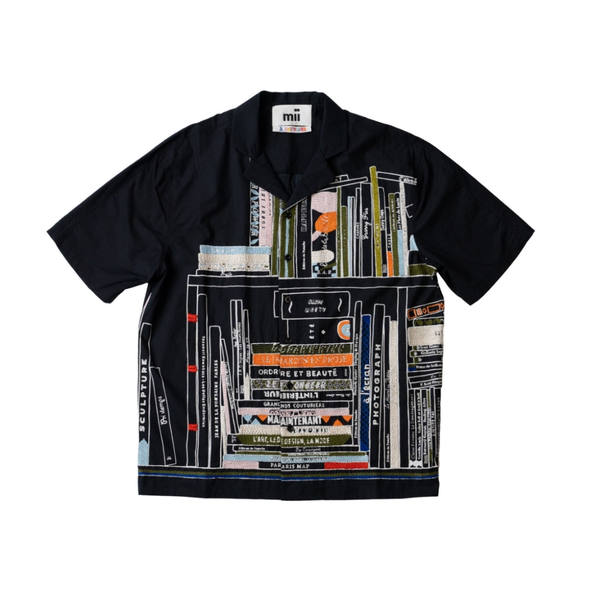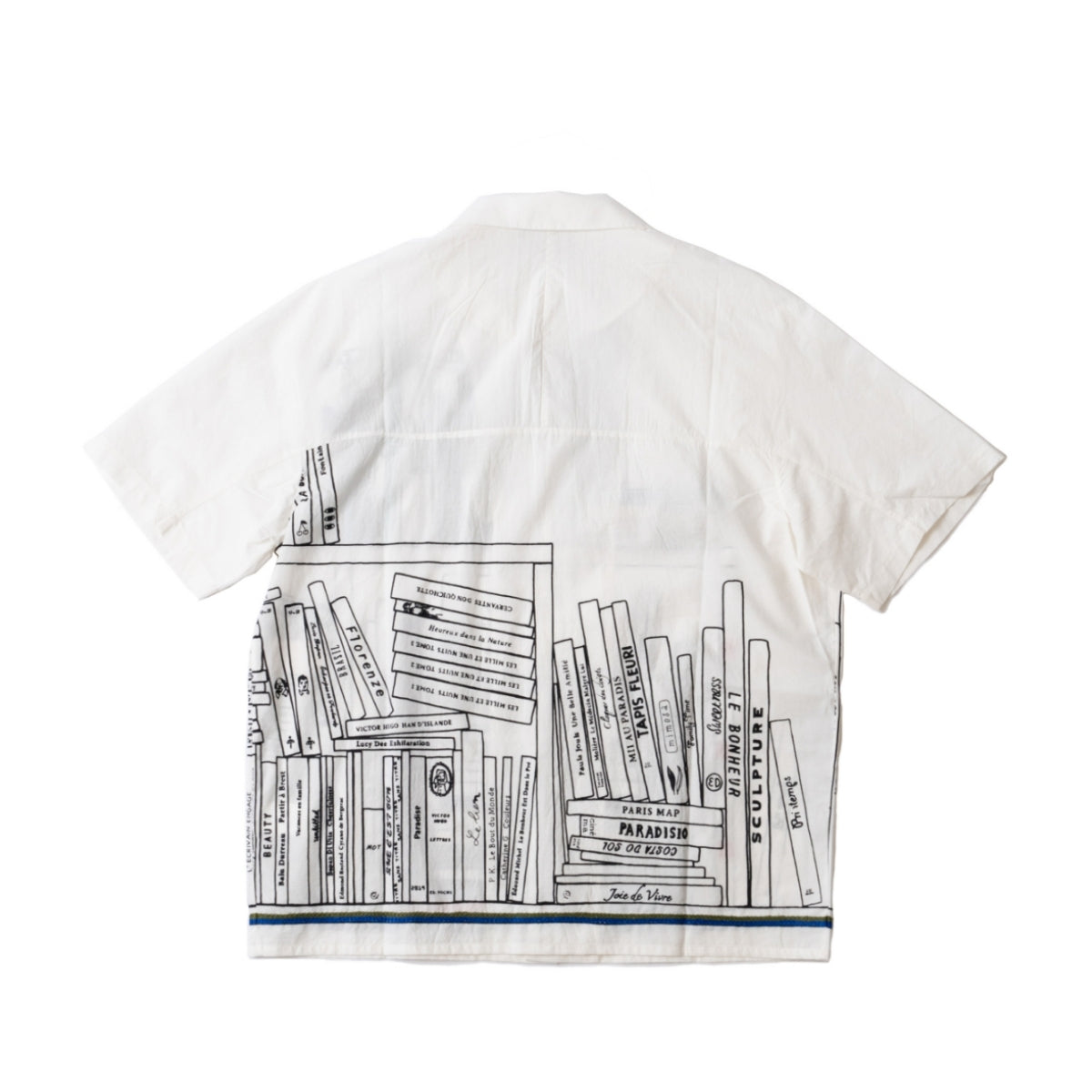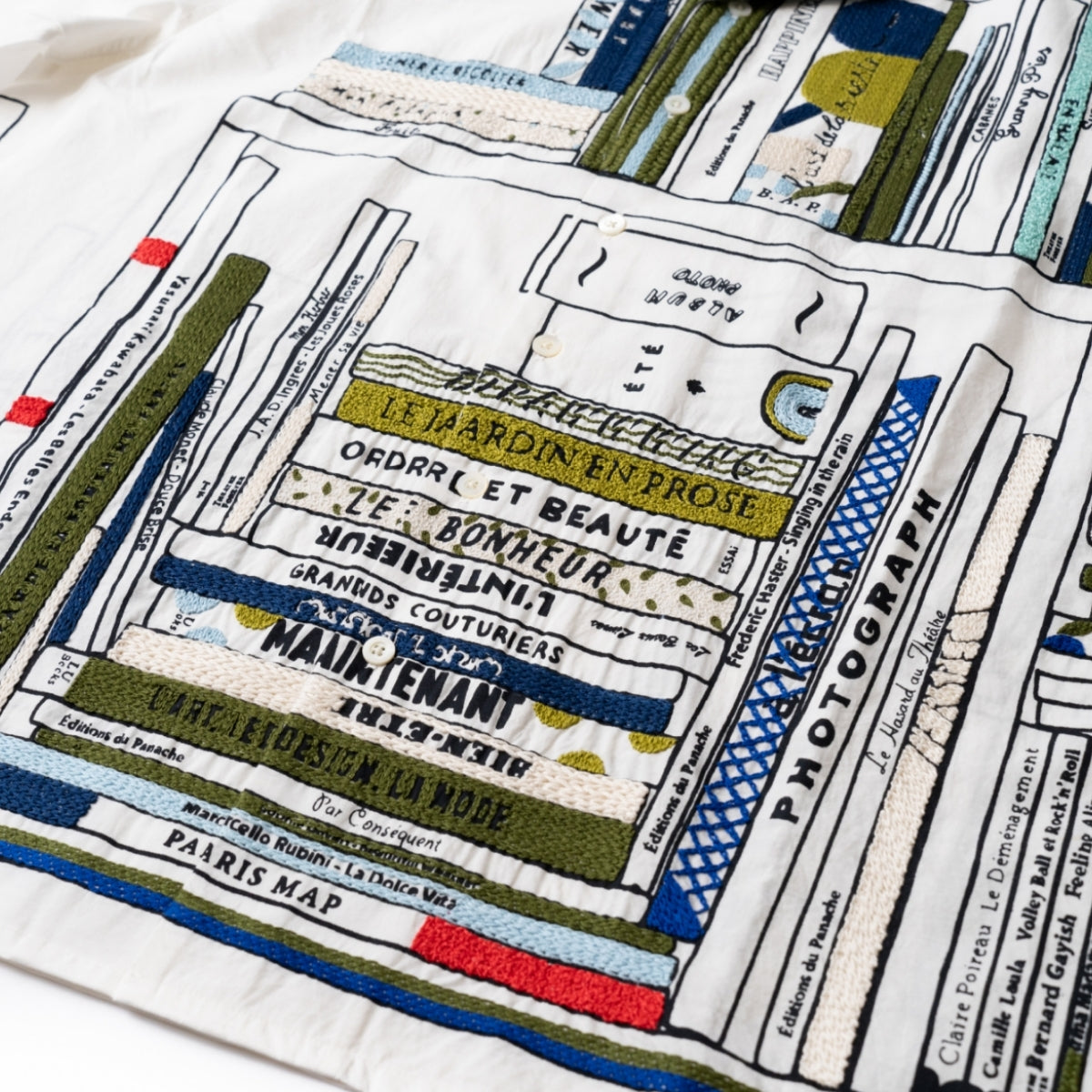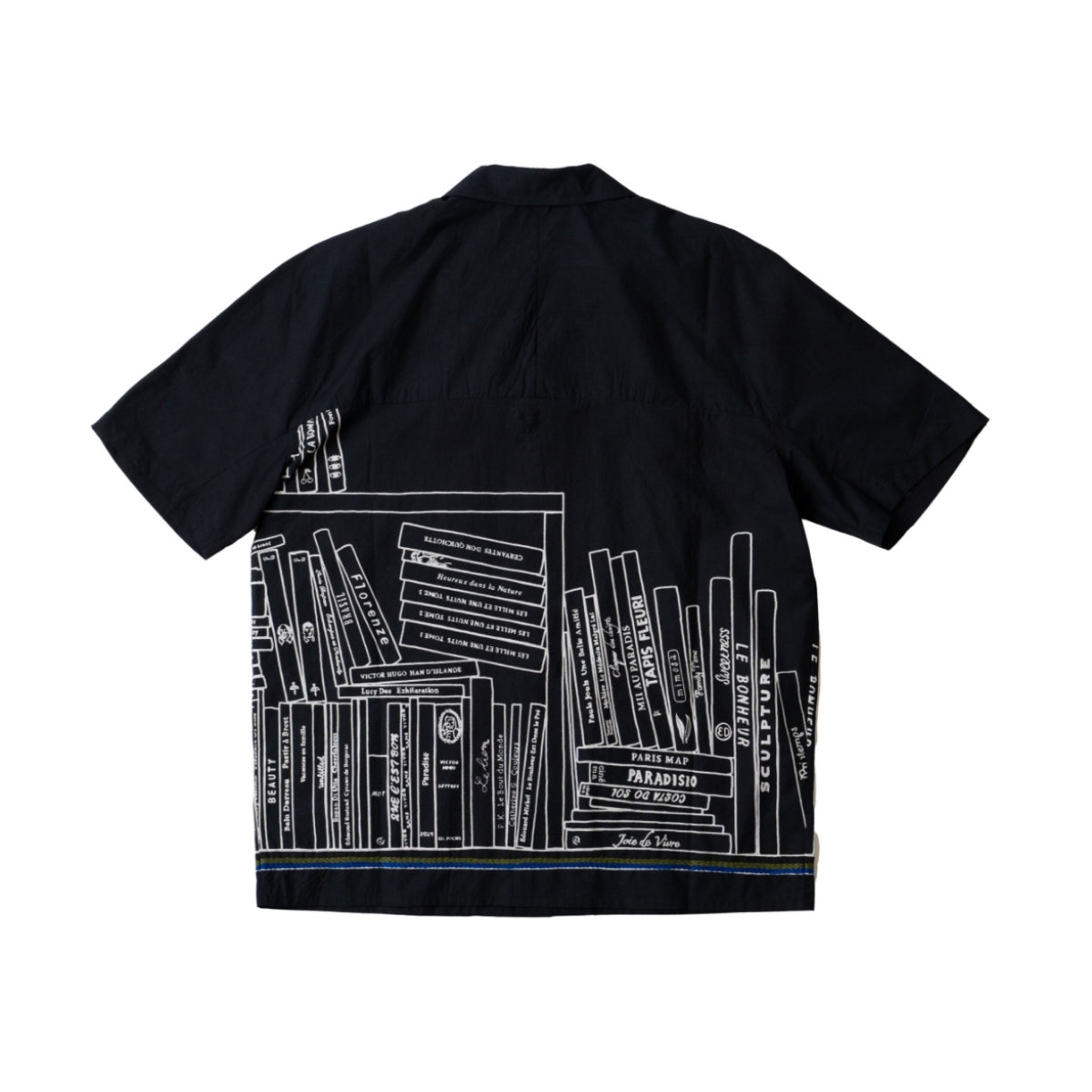 ハンド刺繍とシルクスクリーンプリントという、ブランドを特徴づける技術を組み合わせ、図書館をモチーフとしたオリジナルのライブラリーパターンをデザイン。