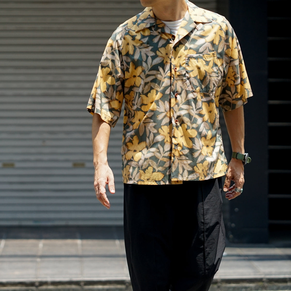 オーガニックコットンを含むコットン/レーヨン素材の半袖開襟シャツ。夏の陽射しに映える花柄プリントにナチュラルなウッドボタンを附属しました。ラグランスリーブのためジャストサイズで着てもオーバーサイズで着ても自然に着こなすことが可能です。背中の中心にはデザインと機能性を持ったボックスプリーツをあしらいました。左胸にパッチポケット付き。