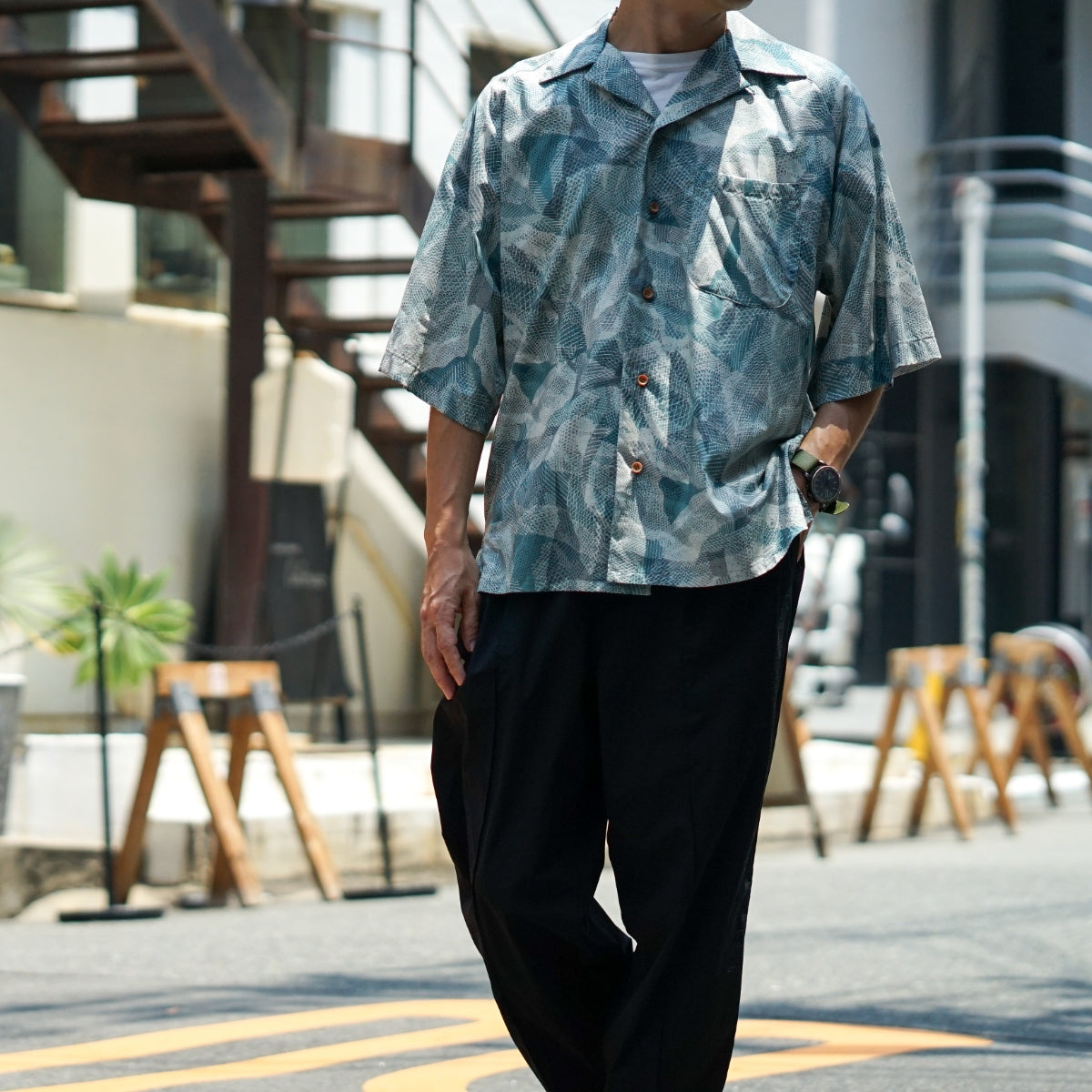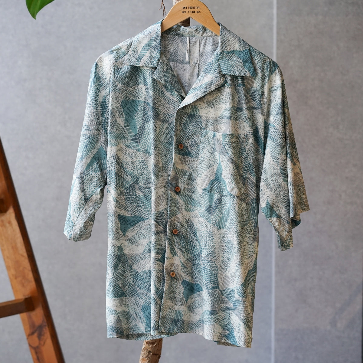 オーガニックコットンを含むコットン/レーヨン素材の半袖開襟シャツ。夏の陽射しに映えるリーフ柄プリントにナチュラルなウッドボタンを附属しました。ラグランスリーブのためジャストサイズで着てもオーバーサイズで着ても自然に着こなすことが可能です。背中の中心にはデザインと機能性を持ったボックスプリーツをあしらいました。左胸にパッチポケット付き。